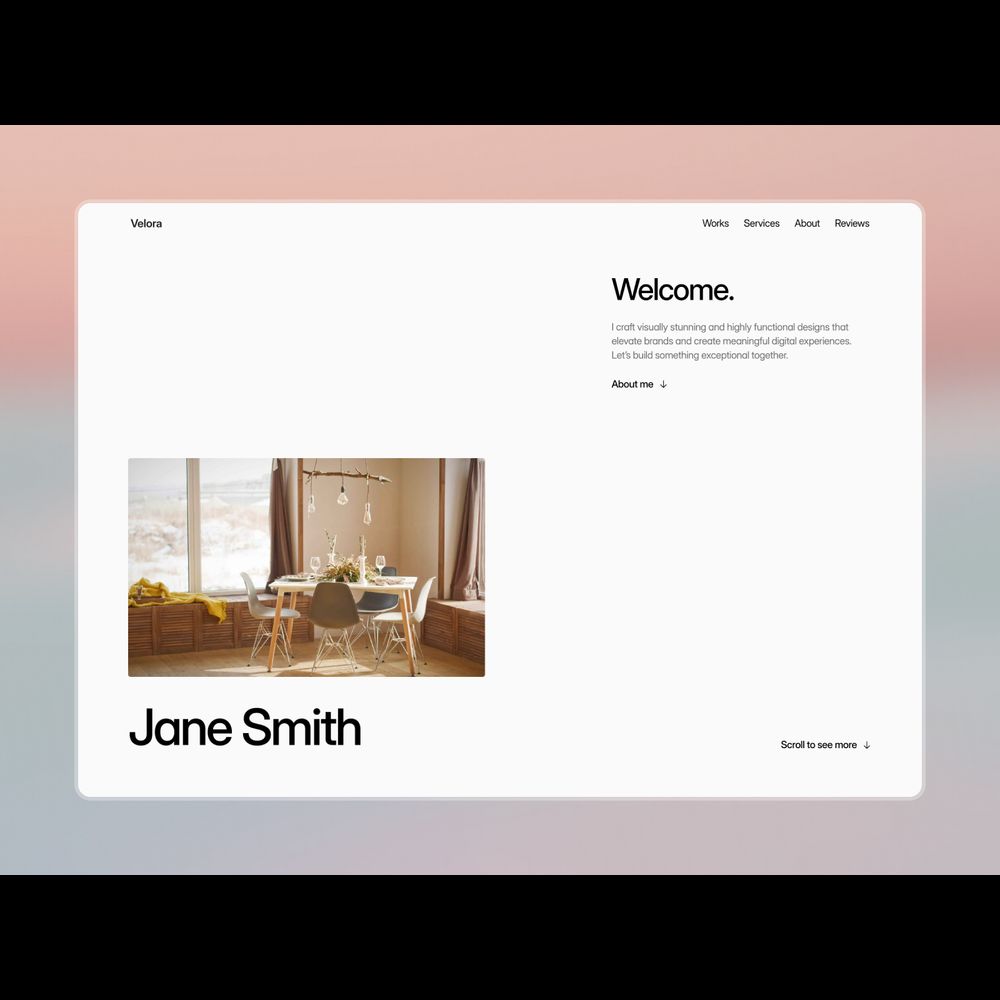 Showcase your work, highlight your services, and tell your story with Velora. Designed for creatives, this modern portfolio template helps you make a lasting impression with a clean, professional layout.Live Preview What's Included: Framer template3 months of Framer Pro (annual plan) for freeQuick-start tutorials (8 topics + 11 videos)Free lifetime support*For Figma add-ons: Only desktop screens are included Refund Policy: As all of our products are digital, all sales are final and refunds are not available. Please review all product details thoroughly before making a purchase. If you have any questions or need clarification, don't hesitate to contact us before completing your order.